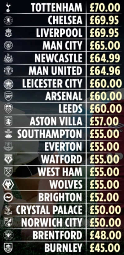 가장 높은 가격에 유니폼을 판매하는 팀은 다름 아닌 토트넘 홋스퍼였다. 한 벌당 70파운드(한화 약 11만 원)로 잉글랜드 20개 구단 중 가장 비쌌다. 반면 가장 저렴한 유니폼은 번리의 유니폼이었다. 토트넘의 유니폼보다 25파운드 저렴한 45파운드(약 7만 원)였다.