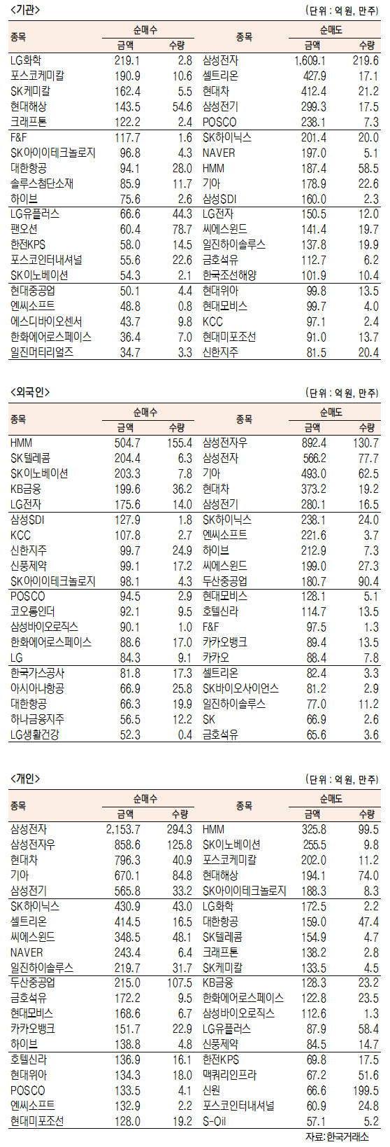 [표]유가증권 기관·외국인·개인 순매수·도 상위종목(10월 1일)