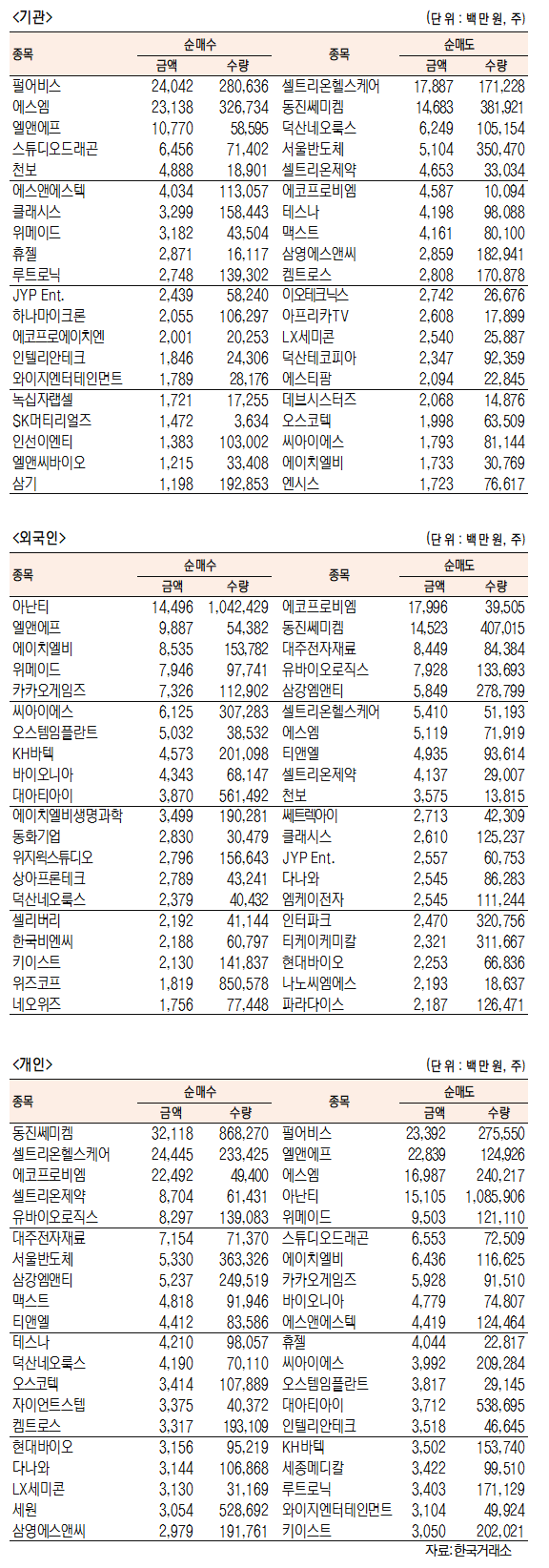 [표]코스닥 기관·외국인·개인 순매수·도 상위종목(10월 1일)