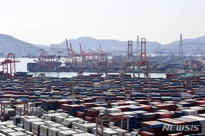 [부산=뉴시스] 하경민 기자 = 산업통상자원부는 9월 수출이 전년 동월 대비 16.7% 늘어난 558억3000만 달러를 기록, 무역통계가 집계되기 시작한 1956년 이후 65년 만에 최고치를 달성했다고 밝혔다. 1일 부산 남구 신선대부두(아래)와 감만부두(위)에서 컨테이너 선적·하역작업이 진행되고 있다. 2021.10.01. yulnetphoto@newsis.com