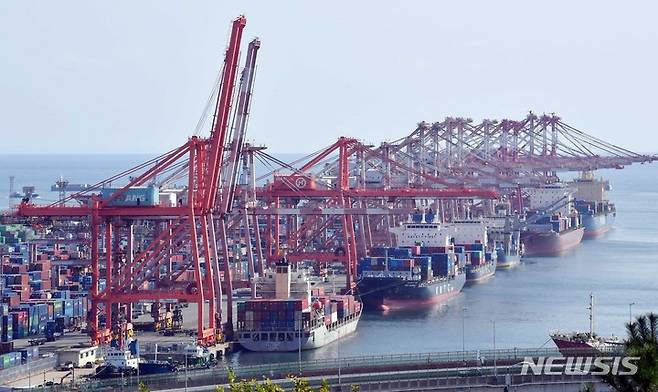 [부산=뉴시스] 하경민 기자 = 산업통상자원부는 9월 수출이 전년 동월 대비 16.7% 늘어난 558억3000만 달러를 기록, 무역통계가 집계되기 시작한 1956년 이후 65년 만에 최고치를 달성했다고 밝혔다. 1일 부산 남구 신선대부두에서 컨테이너 선적·하역작업이 진행되고 있다. 2021.10.01. yulnetphoto@newsis.com