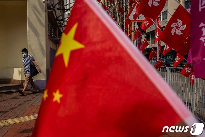 (홍콩 AFP=뉴스1) 금준혁 기자 = 30일(현지시간) 홍콩 도심에 10월 1일 국경절에 앞서 중국과 홍콩의 깃발이 걸려있다.