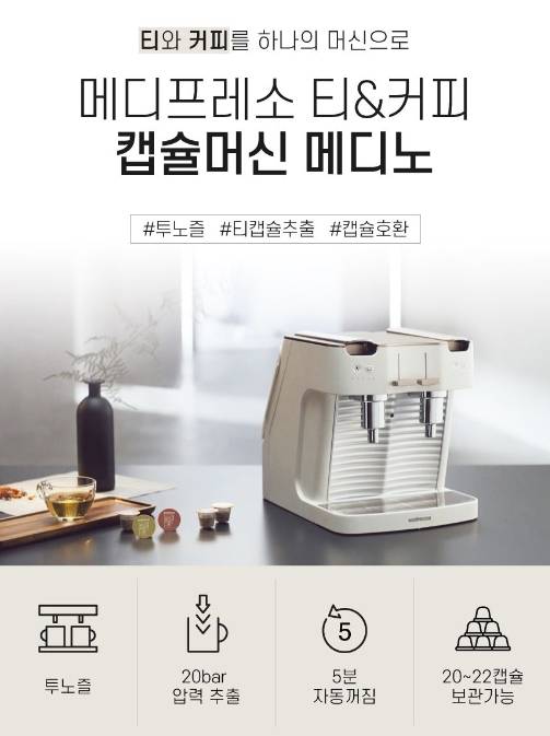 1일 메디프레소는 차와 커피를 2개의 별도 노즐에서 내려마실 수 있는 캡슐머신 '메디노'의 와디즈 펀딩을 22일까지 진행한다고 밝혔다. 최근 캡슐커피 머신 보급이 많아지면서 '홍차' '녹차'등 티 제품도 캡슐로 마실 수 있게 됐다.