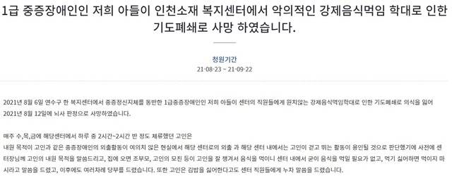 한편, 자신을 피해 남성의 부모라고 밝힌 청원인은 국민청원 게시판을 통해 “2021년 8월 6일 인천 연수구 한 복지센터에서 중증정신지체를 동반한 1급 중증장애인인 저희 아들이 센터의 직원들에게 원치않는 강제로 음식을 먹였다”며 “이 학대로 인한 기도폐쇄로 20대 아들은 의식을 잃어 2021년 8월12일에 뇌사 판정으로 사망했다”고 주장했다.