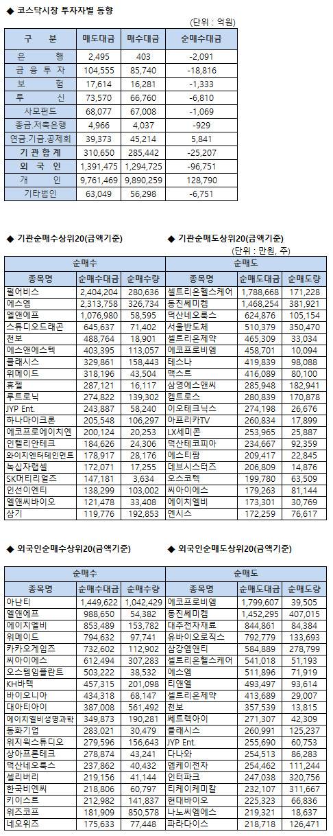 [표]코스닥 기관/외국인 매매동향(10/1 3시30분)