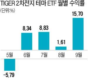 ‘KODEX 2차전지산업’은 2차전지 대형주 비중이 높은 편인데 올 들어 지난달까지 수익률이 52.88%(월평균 수익률 5.16%)다. 2차전지 중소형주 비중이 높은 ‘TIGER 2차전지 테마’는 올해 수익률이 63.59%(월평균 수익률 5.93%)에 달한다.