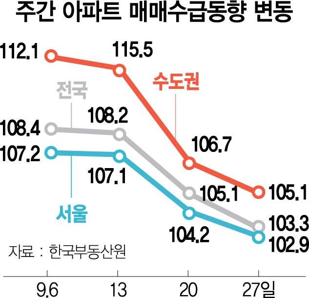 1일 한국부동산원이 발표한 9월 넷째 주 통계를 보면 전국 아파트 매매수급지수가 지난주(105.1)보다 1.8포인트 떨어진 103.3으로 집계됐다. 9월 첫째 주 108.4를 기록한 후 3주 연속 하락세를 보이며 올해 최저 수준으로 떨어졌다. 0부터 200 사이의 숫자로 표현되는 매매수급지수가 기준점인 100 이상이면 아파트를 매수하려는 사람이 매도하려는 사람보다 더 많다는 의미다.