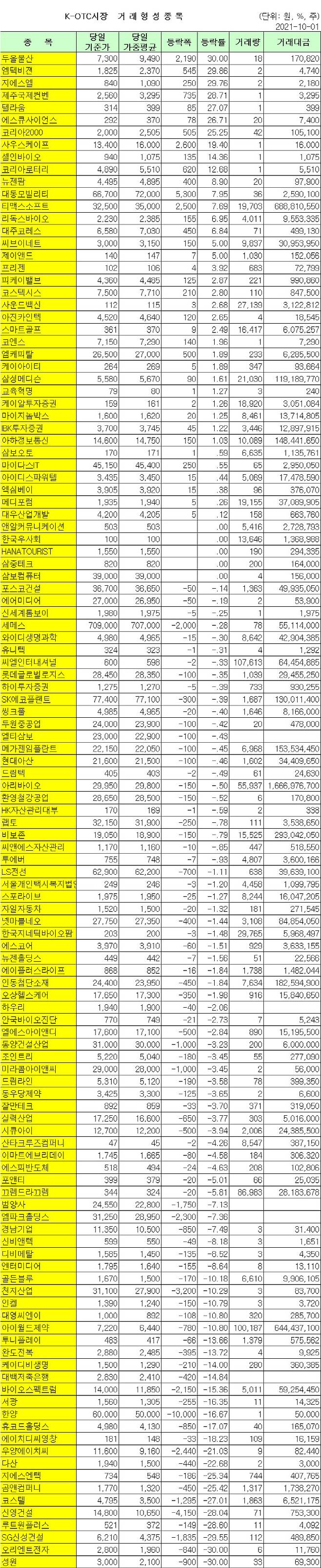 [이데일리 유준하 기자] 다음은 10월1일 K-OTC 시장 거래 현황이다.