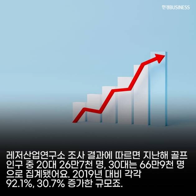 레저산업연구소 조사 결과에 따르면 지난해 골프 인구 중 20대는 26만7천 명, 30대는 66만9천 명으로 집계됐어요. 2019년 대비 각각 92.1%, 30.7% 증가한 규모죠.