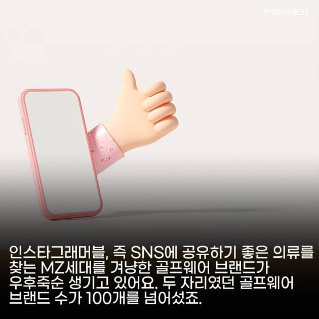 인스타그래머블, 즉 SNS에 공유하기 좋은 의류를 찾는 MZ세대를 겨냥한 골프웨어 브랜드가 우후죽순 생기고 있어요. 두 자리였던 골프웨어 브랜드 수가 100개를 넘어섰죠.