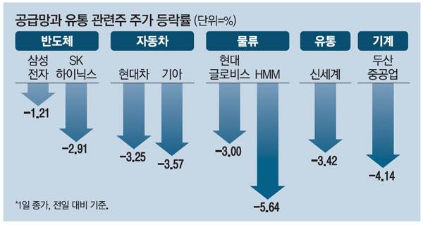 물가가 급등하면 매출이 떨어지는 유통주 또한 이날 직격탄을 맞았다. 물가는 올라가는데 경기 둔화로 지갑이 얇아지는 이른바 '스태그플레이션'이 오면 유통업체 실적은 급격히 감소한다. 또한 유통망 위기로 제때 해외에서 물품을 조달받지 못하면 유통업체는 매출 하락이 불가피하다.
