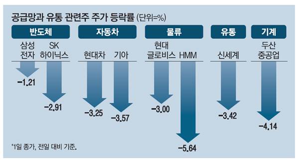물가가 급등하면 매출이 떨어지는 유통주 또한 이날 직격탄을 맞았다. 물가는 올라가는데 경기 둔화로 지갑이 얇아지는 이른바 '스태그플레이션'이 오면 유통업체 실적은 급격히 감소한다. 또한 유통망 위기로 제때 해외에서 물품을 조달받지 못하면 유통업체는 매출 하락이 불가피하다.