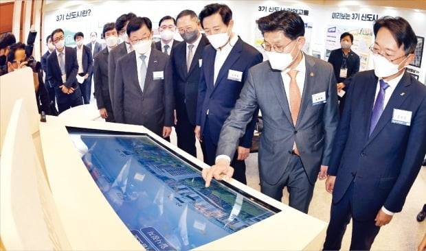 국내 최대 건설·부동산 축제 ‘집코노미 박람회’ 개막 한국경제신문사가 주최하는 국내 최대 건설·부동산 박람회 ‘집코노미 박람회 2021’이 1일 서울 삼성동 코엑스(D홀)에서 개막했다. 올해 7회째를 맞은 이 박람회는 코로나19 방역 수칙을 철저히 준수하면서 오프라인 행사로 진행됐다. 노형욱 국토교통부 장관이 LH 부스에서 3기 신도시 사전청약을 소개하는 가상현실(VR) 평면을 가리키고 있다. 오른쪽부터 김현준 LH 사장, 노 장관, 오세훈 서울시장, 김정호 한국경제신문 사장, 윤영준 현대건설 사장, 김승배 한국부동산개발협회 회장, 안성우 한국프롭테크포럼 의장, 이윤상 한국부동산분양서비스협회 회장.