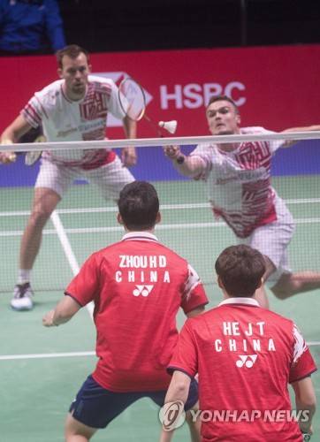 epa09499287 He Ji Ting and Zhou Hao Dong of China compete against Anders Skaarup Rasmussen and Frederik Sogaard of Denmark in the Men's Doubles at the BWF 2021 Sudirman Cup Badminton tournament in Vantaa, Finland, 01 October 2021. EPA/MAURI RATILAINEN