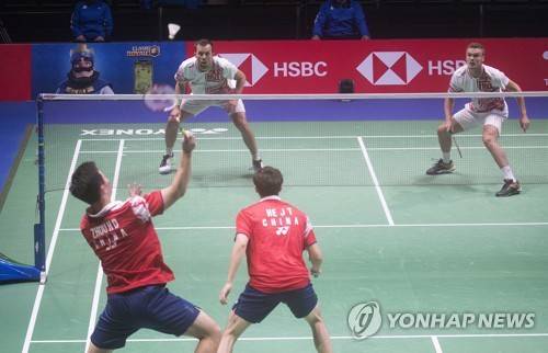 epa09499285 He Ji Ting and Zhou Hao Dong of China compete against Anders Skaarup Rasmussen and Frederik Sogaard of Denmark in the Men's Doubles at the BWF 2021 Sudirman Cup Badminton tournament in Vantaa, Finland, 01 October 2021. EPA/MAURI RATILAINEN