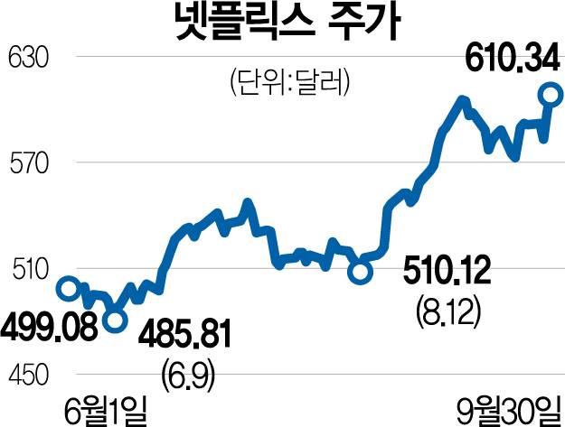 30일(현지 시간) 뉴욕 증시 나스닥에 상장돼 있는 넷플릭스는 전일보다 1.88% 오른 610.34달러에 마감했다. 이날 장중 최고 619달러를 찍기도 했다.