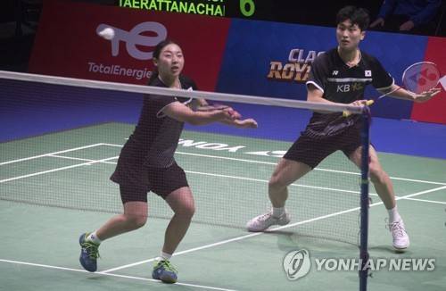 epa09499282 Kim Wonho and Kong Heeyong of South Korea compete against Dechapol Puavaranukroh and Sapsiree Taerattanachai of Thailand (not pictured) in the Mixed Doubles at the BWF 2021 Sudirman Cup Badminton tournament in Vantaa, Finland, 01 October 2021. EPA/MAURI RATILAINEN