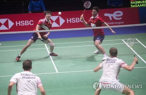 epa09499288 He Ji Ting and Zhou Hao Dong of China compete against Anders Skaarup Rasmussen and Frederik Sogaard of Denmark in the Men's Doubles at the BWF 2021 Sudirman Cup Badminton tournament in Vantaa, Finland, 01 October 2021. EPA/MAURI RATILAINEN
