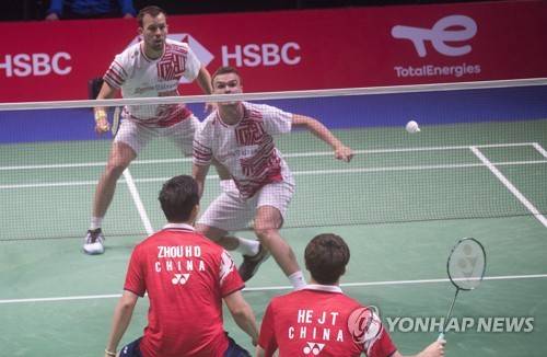 epa09499296 He Ji Ting and Zhou Hao Dong of China compete against Anders Skaarup Rasmussen and Frederik Sogaard of Denmark in the Men's Doubles at the BWF 2021 Sudirman Cup Badminton tournament in Vantaa, Finland, 01 October 2021. EPA/MAURI RATILAINEN