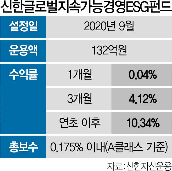 지난해 9월 17일 출시된 신한글로벌지속가능경영ESG펀드는 설정액 132억 원(지난달 말 기준)으로 다른 대형 펀드에 비하면 작다고 볼 수 있지만 퇴직연금 클래스 중에서도 적립식 투자가 많은 C-re클래스에 올해에만 97억 원의 자금이 모이며 투자자들의 관심을 받고 있다.