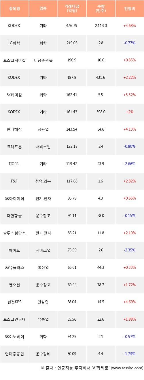 KODEX 200선물인버스2X, 포스코케미칼, KODEX 코스닥150선물인버스 등은 전일 대비 주가가 상승했고, LG화학, 크래프톤, TIGER 미국S&P500선물(H) 등은 주가가 하락했다.