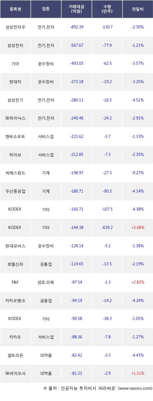 외국인 투자자의 순매도 상위 20개 종목은 삼성전자우, 삼성전자, 기아, 현대차, 삼성전기, SK하이닉스, 엔씨소프트, 하이브, 씨에스윈드, 두산중공업등이다.