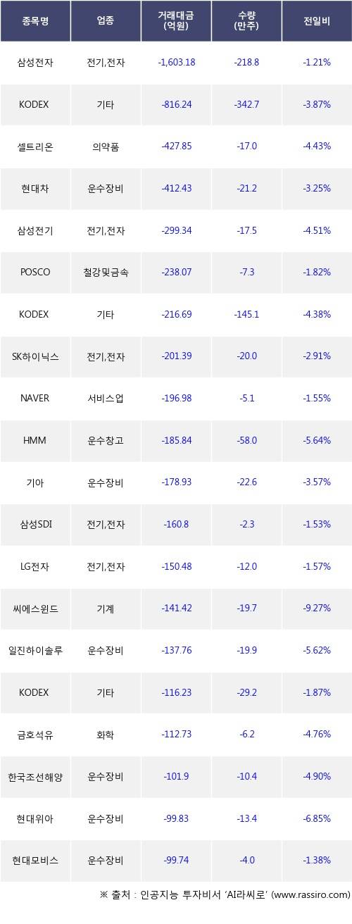 이날 기관 투자자가 순매도한 종목들 중에 삼성전자, KODEX 레버리지, 셀트리온 등은 전일 대비 주가가 하락했다.