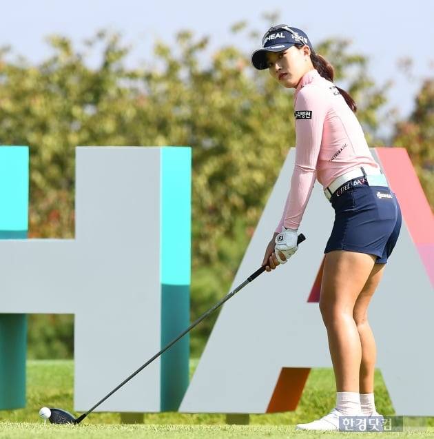 KLPGA(한국여자프로골프)투어 '하나금융그룹 챔피언십'(총상금 15억 원) 2라운드 경기가 1일 경기도 포천 아도니스 컨트리클럽(파71·6480야드)에서 열렸다. 대회에 출전한 안지현이 1번 홀에서 티샷하고 있다.