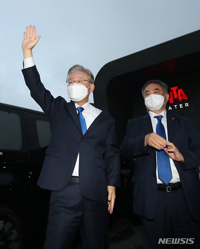 [제주=뉴시스] 우장호 기자 = 더불어민주당 이재명 대선경선후보가 1일 오후 제주시 오등동 호텔난타에서 열린 민주당 대선 후보 선출을 위한 제주 합동연설회에서 1위를 차지한 후 지지자들에게 인사하고 있다. 2021.10.01. woo1223@newsis.com
