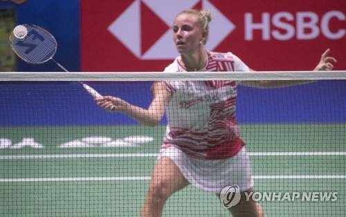 epa09499443 Mia Blichfeldt of Denmark in action during her women's singles macht against Chen Yu Fei of China during the quarterfinal tie between China and Denmark at the BWF 2021 Sudirman Cup Badminton tournament in Vantaa, Finland, 01 October 2021. EPA/MAURI RATILAINEN