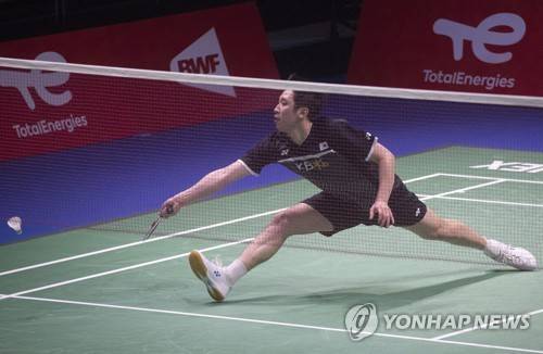 epa09499453 Heo Kwanghee of Korea in action during his men's singles match against Kunlavut Vitidsarn of Thailand for the quarterfinal tie between South Korea and Thailand at the BWF 2021 Sudirman Cup Badminton tournament in Vantaa, Finland, 01 October 2021. EPA/MAURI RATILAINEN