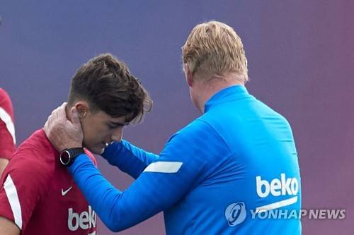 epa09499466 FC Barcelona's head coach Ronald Koeman and his player Pablo Paez Gavira 'Gavi' attend s training session at Joan Gamper sport premises in Barcelona, Catalonia, north-eastern Spain, 01 October 2021. FC Barcelona will face Atletico Madrid in a Spanish LaLiga soccer match on 02 October. EPA/ALEJANDRO GARCIA