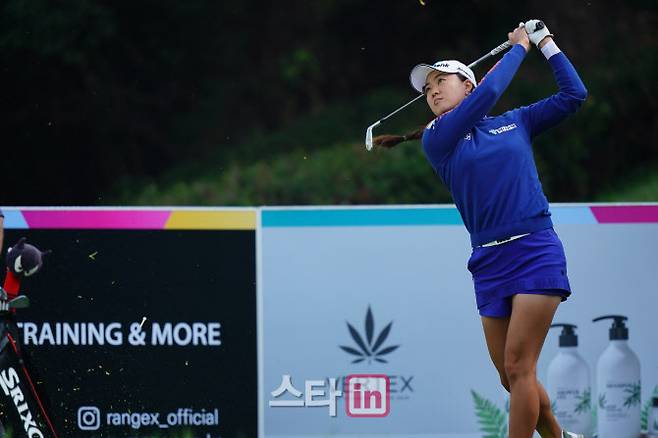 [이데일리 골프in=포천 박태성 기자] 1일 경기 포천시 아도니스CC(파71/6,480야드)에서 한국여자프로골프(KLPGA)투어 스물세 번째 대회인 '하나금융그룹챔피언십'(총상금 15억원,우승상금 2억 7천만 원) 2라운드가 열렸다.이민지(하나금융그룹)가 17번홀 아이언 티샷을 날리고 있다.