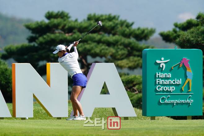 [이데일리 골프in=포천 박태성 기자] 1일 경기 포천시 아도니스CC(파71/6,480야드)에서 한국여자프로골프(KLPGA)투어 스물세 번째 대회인 '하나금융그룹챔피언십'(총상금 15억원,우승상금 2억 7천만 원) 2라운드가 열렸다.이민지(하나금융그룹)가 1번홀 티샷을 날리고 있다.