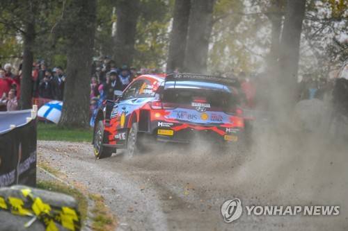 epa09499542 Belgium's Thierry Neuville and his co-driver Martijn Wydaeghe drive their Hyundai i20 Coupe WRC during the EK/SS1 Harju 1 on the first day of the Secto Automotive Rally Finland as part of the World Rally Championship (WRC) near Jyvaskyla, Finland, 01 October 2021. EPA/KIMMO BRANDT