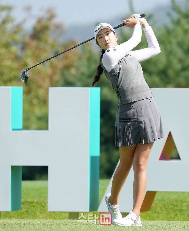 [이데일리 골프in=포천 박태성 기자] 1일 경기 포천시 아도니스CC(파71/6,480야드)에서 한국여자프로골프(KLPGA)투어 스물세 번째 대회인 '하나금융그룹챔피언십'(총상금 15억원,우승상금 2억 7천만 원) 2라운드가 열렸다.노예림(하나금융그룹)이 1번홀 티샷을 날리고 있다.