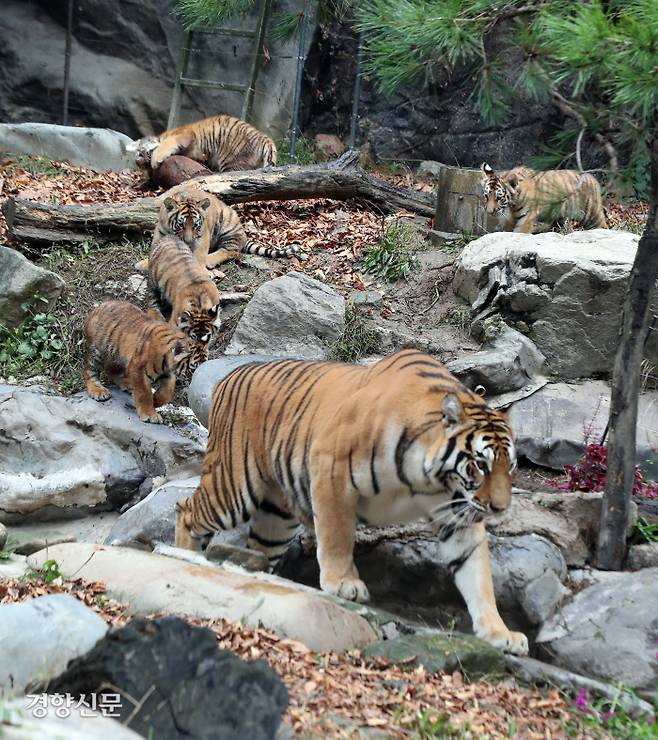 경기 용인시 에버랜드 동물원이 30일 공개한 생후 100일을 앞둔 한국호랑이 5남매가 어미 건곤이 주위에서 놀고 있다. 온라인 투표로 결정된 이름은 아름, 다운, 우리, 나라, 강산이다.