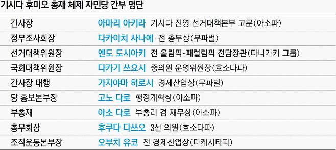 당 부총재는 아소파의 수장이자 아베 전 총리의 정치적 맹우인 아소 부총리로 결정됐다. 고노 다로 행정개혁담당상은 당 홍보본부장을 맡는다. 국회대책위원장에 다카기 쓰요시 중의원운영위원장(호소다파)이, 간사장 대행에 가지야마 히로시 경제산업상(무파벌)이, 조직운동본부장에 오부치 유코 전 경제산업상(다케시타파)이 각각 기용됐다.