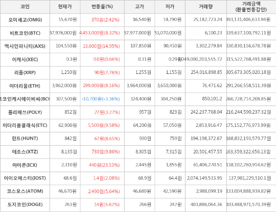 또한, 엑시인피니티(14.95%, 104,550원), 테조스(9.86%, 8,135원), 이더리움클래식(9.58%, 62,900원), 헌트(8.65%, 842원), 이더리움(8.16%, 3,962,000원), 리플(7.76%, 1,250원), 코스모스(5.64%, 46,670원), 도지코인(5.62%, 263원), 폴리매쓰(3.27%, 852원), 오미세고(2.42%, 15,670원), 아이오에스티(2.08%, 68.6원), 이캐시(0.66%, 0.3원)가 상승세를 나타냈다.