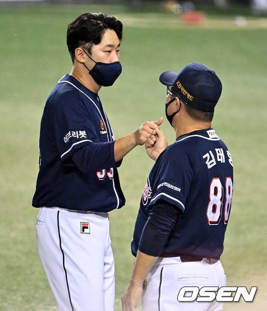경기를 마치고 두산 양석환이 김태형 감독과 승리를 기뻐하고 있다.