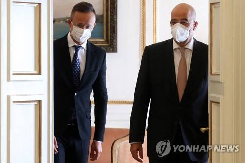 epa09499782 Greek Foreign Minister Nikos Dendias (R), walks together with Peter Szijjarto (L), Foreign Minister of Hungaria, during their meeting in Athens, Greece, 01 October 2021. Foreign Minister of Hungaria is in Athens on an one-day working visit. EPA/ORESTIS PANAGIOTOU