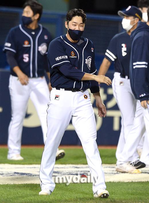 [마이데일리 = 유진형 기자] 두산 양석환이 1일 오후 서울 잠실야구장에서 진행된 '2021 신한은행 SOL KBO리그' LG 트윈스와 두산 베어스의 경기에서 2-0으로 승리한 뒤 기뻐하고 있다.