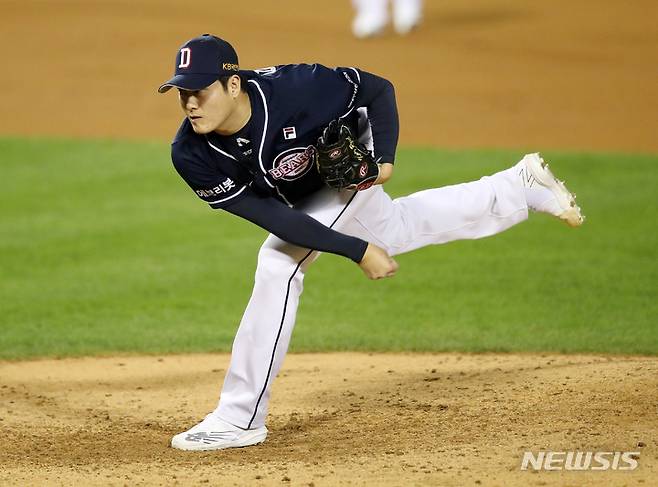 [서울=뉴시스] 조성우 기자 = 1일 오후 서울 송파구 잠실야구장에서 열린 2021 신한은행 SOL KBO리그 두산 베어스와 LG 트윈스 경기, 두산 투수 김강률이 LG 9회말 공격 때 마운드에 올라 역투하고 있다. 2021.10.01. xconfind@newsis.com