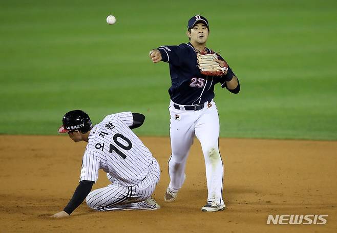 [서울=뉴시스] 조성우 기자 = 1일 오후 서울 송파구 잠실야구장에서 열린 2021 신한은행 SOL KBO리그 두산 베어스와 LG 트윈스 경기, 두산 2루수 강승호가 LG 9회말 공격 무사 주자 1, 2루서 김민성의 타구를 잡아 병살로 연결시키고 있다. 2021.10.01. xconfind@newsis.com