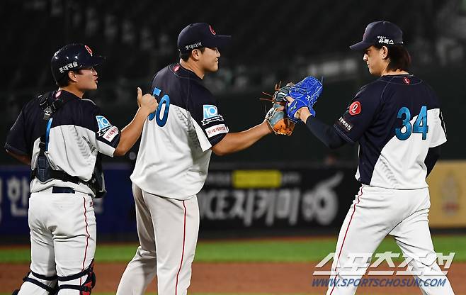 2021 KBO리그 롯데 자이언츠와 KT 위즈의 DH 2차전 경기가 1일 부산 사직구장에서 열렸다. 경기에서 3대2로 승리한 KT와의 3연전을 스윕한 롯데 선수들이 기뻐하고 있다. 부산=박재만 기자 pjm@sportschosun.com/2021.10.01/