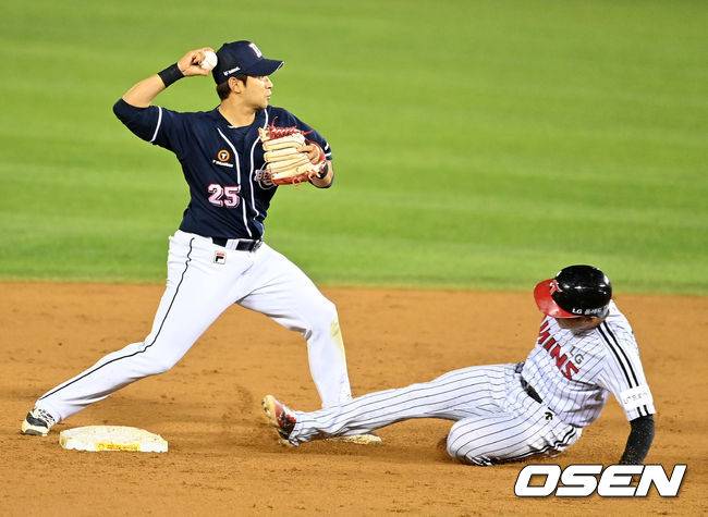 9회말 무사 1,2루에서 두산 강승호가 LG 김민성의 유격수 땅볼에 오지환을 포스아웃시키고 1루로 송구하고 있다.