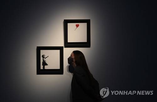 epa09499800 A gallery employee stands next to an artwork by British artist Banksy titled 'Girl and Ballon' (two parts) during a press view at the Christie's auction house in London, Britain on 01 October 2021. The painting is expected to fetch some 2.5 million GBP or between 3 to 4.1 million euros. EPA/FACUNDO ARRIZABALAGA