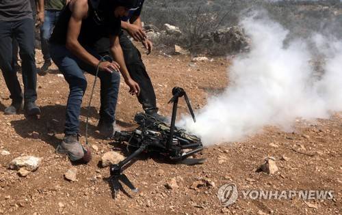 epa09499802 Palestinian protesters smash an Israeli Army drone used to throw tear gas grenades after it fell down during clashes after a demonstration against Israel's settlements on the lands of Beita village near the West Bank city of Nablus, 01 October 2021. EPA/ALAA BADARNEH