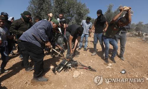 epa09499799 Palestinian protesters smash an Israeli Army drone used to throw tear gas grenades after it fell down during clashes after a demonstration against Israel's settlements on the lands of Beita village near the West Bank city of Nablus, 01 October 2021. EPA/ALAA BADARNEH