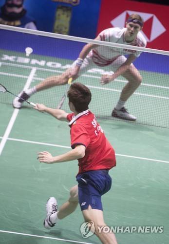 epa09499806 Viktor Axelsen of Denmark in action against Shi Yu Qi (front) of China during the quarterfinal tie between China and Denmark at the BWF 2021 Sudirman Cup Badminton tournament in Vantaa, Finland, 01 October 2021. EPA/MAURI RATILAINEN